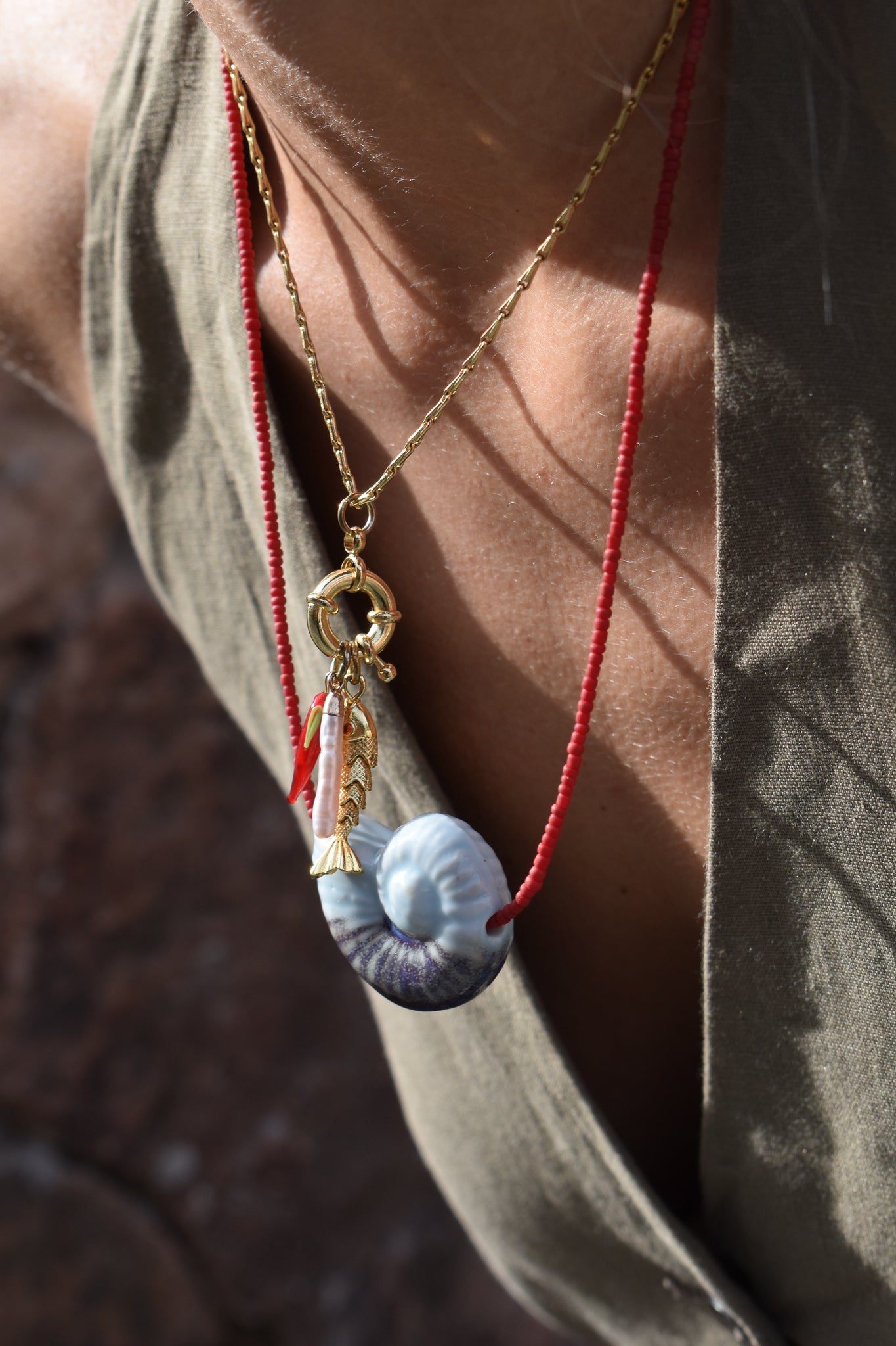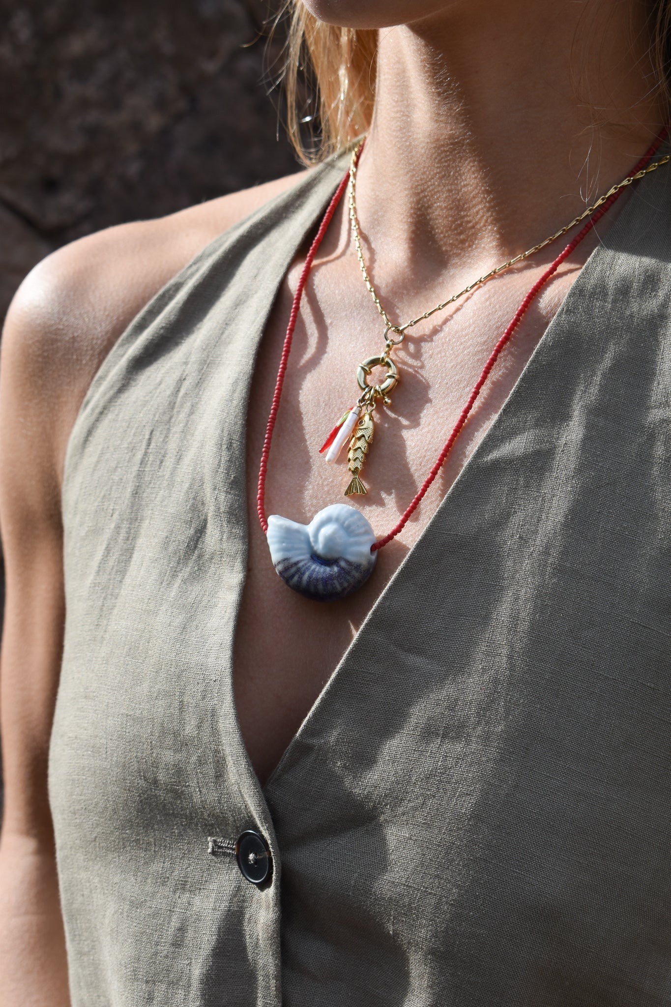 Collar de hilo transparente ajustable con mostacilla de cerámica y vidrio.