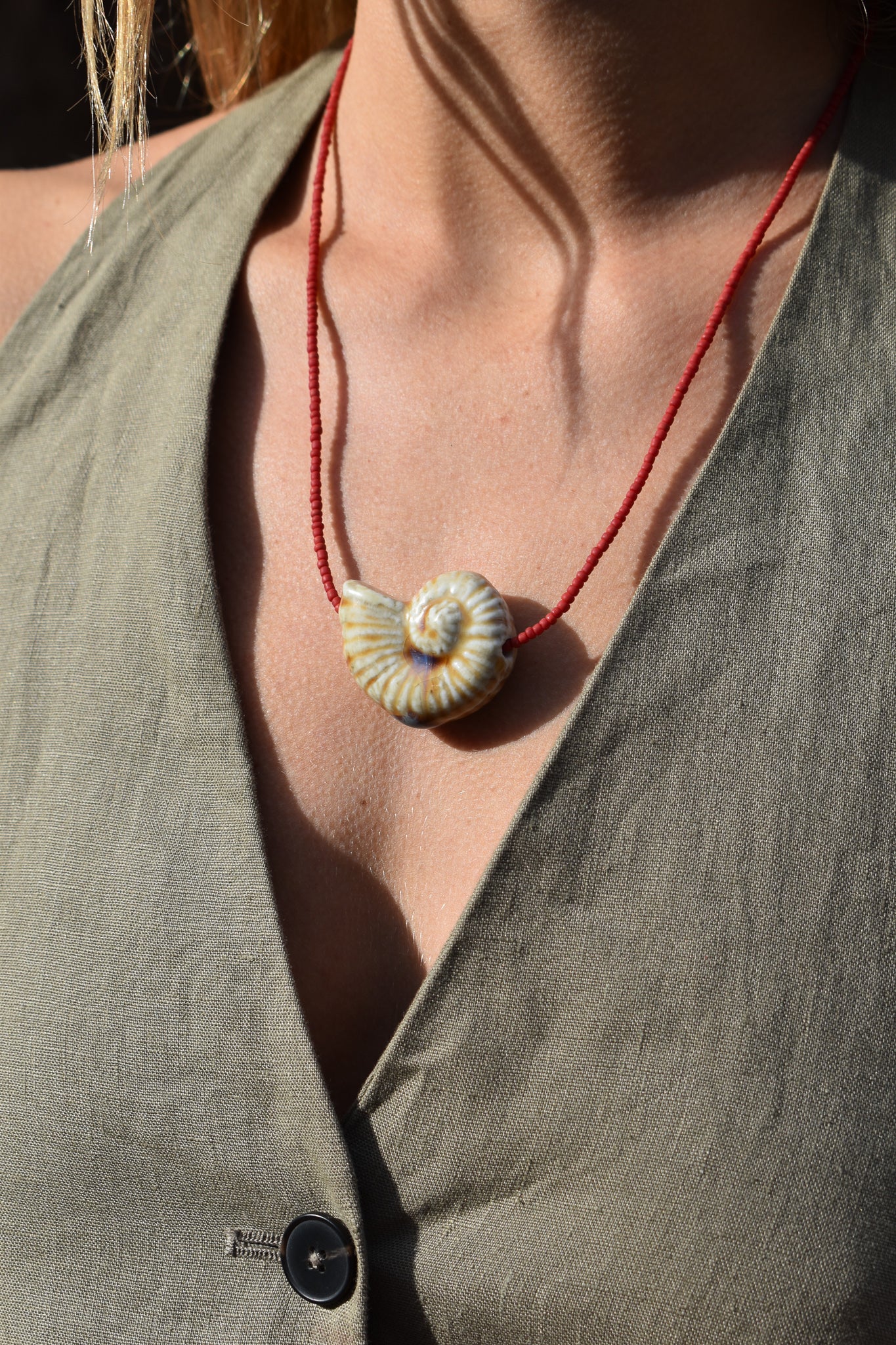 Collar de hilo transparente ajustable con mostacilla de cerámica y vidrio.