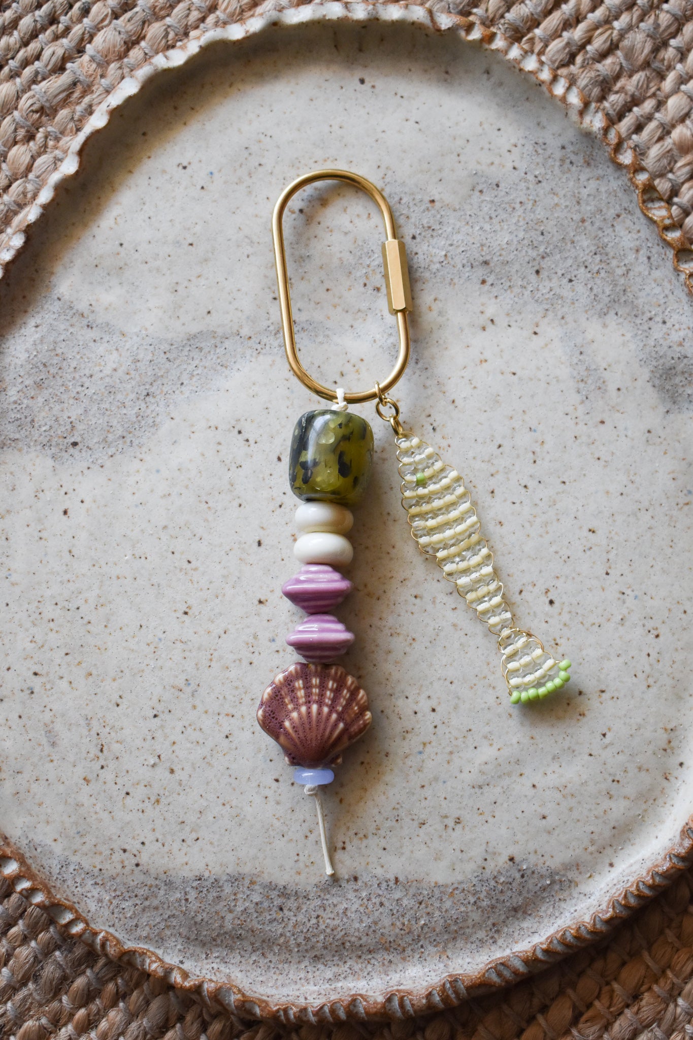 Llaveros hechos con mostacillas de cerámica y vidrio.