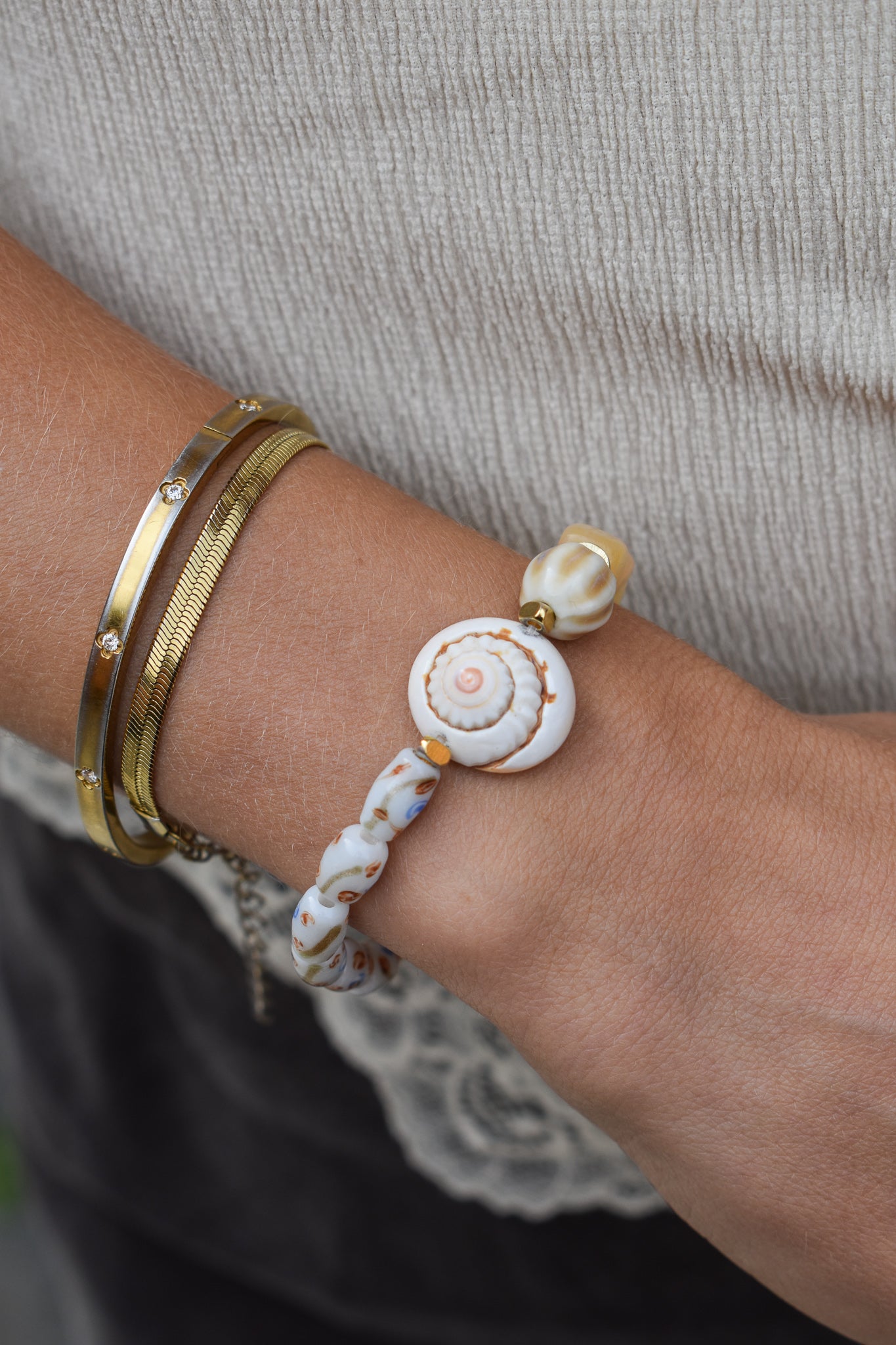 Pulsera de elástico transparente con mostacillas de cerámica, vidrio y concha natural.